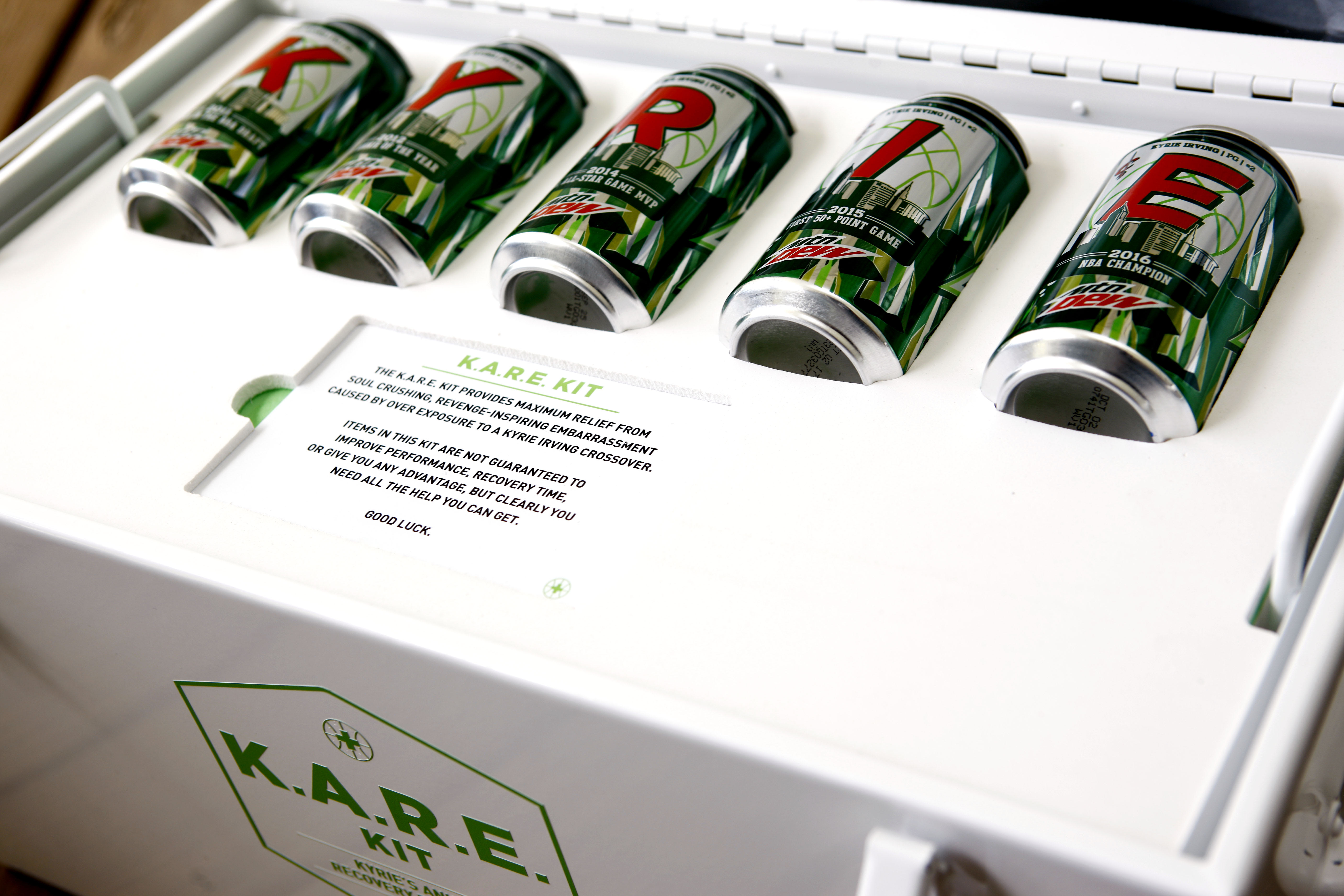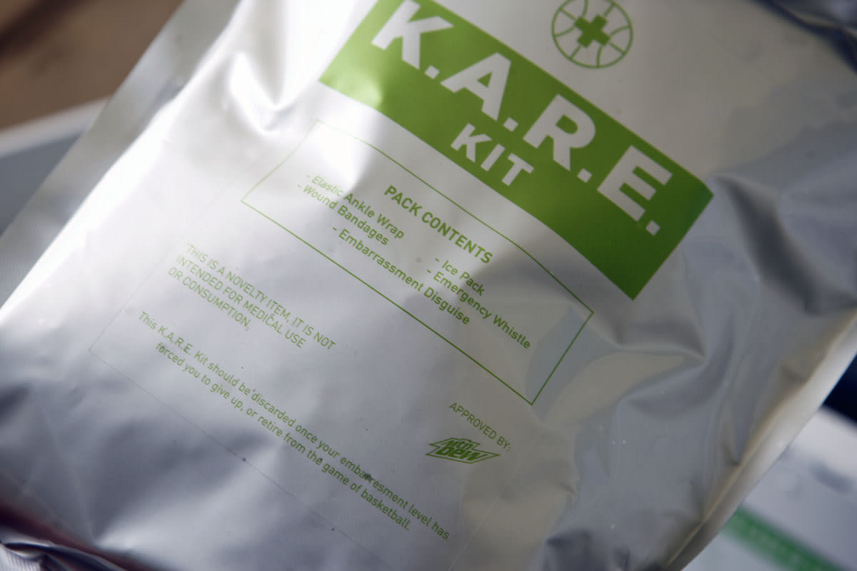 Irving is known as one of the best ball-handlers in the NBA. Designers at Nike and Mountain Dew took that fact into consideration when brainstorming their new concept. Those lucky enough to acquire the new shoe will find a special “K.A.R.E.” kit tucked neatly inside the box. What does K.A.R.E stand for, you ask? It’s an acronym for “Kyrie’s Ankle Recovery Equipment.” Fitting, as Irving often makes defenders look silly with his crossover and hesitation dribbles.